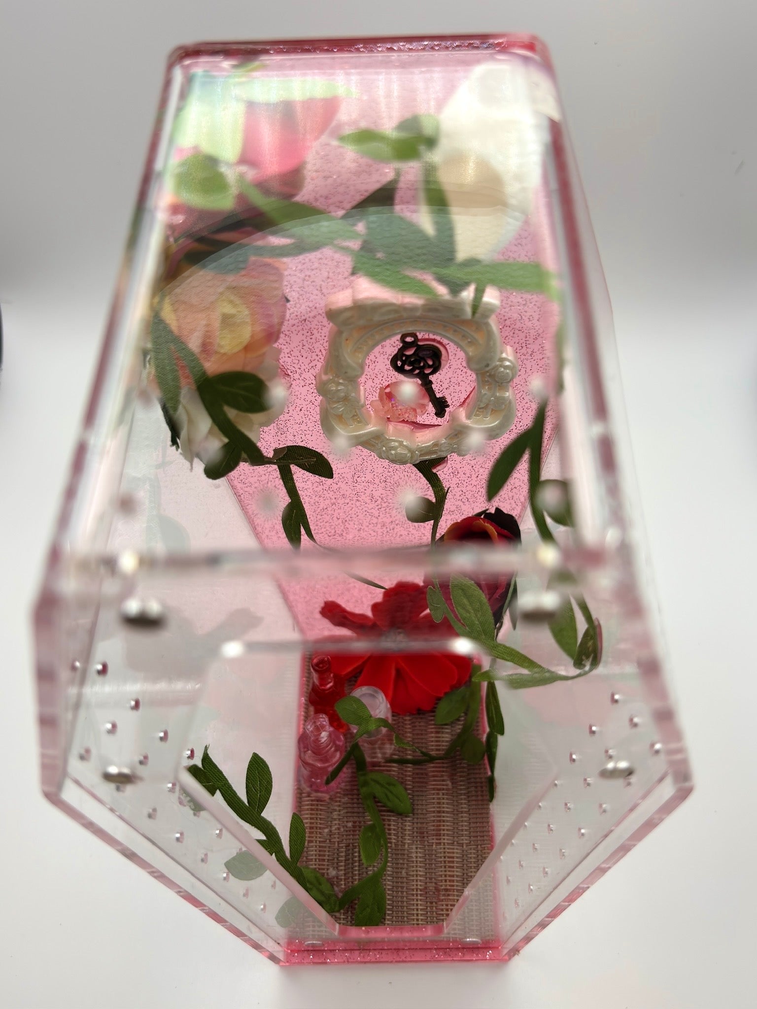 Romantic and gothic meet in this stunning coffin-shaped Critterrarium. Featuring soft pink shimmer walls, climbing ivy, and deep red and blush roses, it’s a breathtaking display for your jumper. A vintage-style key frame adds a touch of mystery, while thoughtful ventilation and secure acrylic panels keep your spider safe and comfortable.